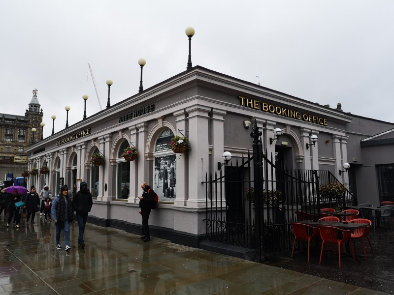 Chain pub known for its range of ales and music free policy above Waverley train station.