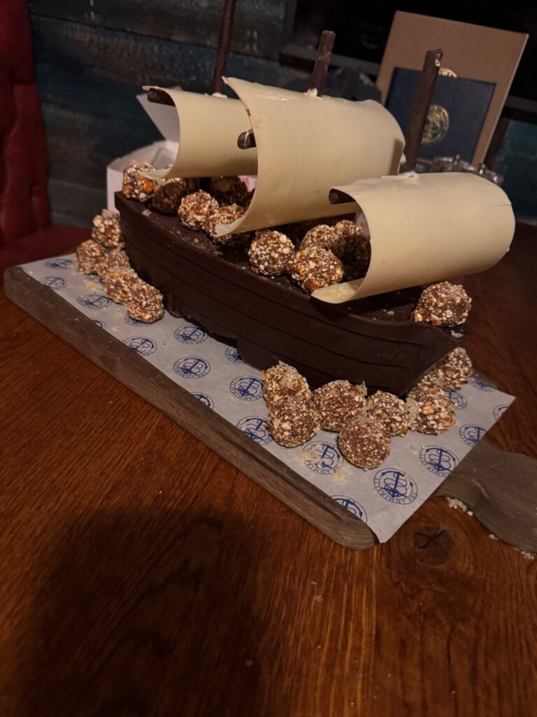 This year’s celebrations had an additional twist – a chocolate ship competition open to Fuller’s Chef Apprentices. Chef Apprentices were invited to enter a competition to build a chocolate replica of the HMS Victory for the Ships of the Line parade. Entrants were asked their favourite chocolate and what flavours they would include in their own chocolate truffle creations. From those who entered, three Chef Apprentices were selected for their creative use of flavours – Charlie Welch from The Crown Inn, Bishops Waltham; Nelly Bennett from The Swan Hotel, Staines; and Aedan Mcdonagh from The Distillers, Hammersmith. The three Chef Apprentices spent the day learning to build the ships under the guidance of renowned Pastry Lecturer Steve James at Capital City College in Westminster. On the night, Nelly Bennett was crowned the winner of the competition for her salted caramel popcorn truffles.